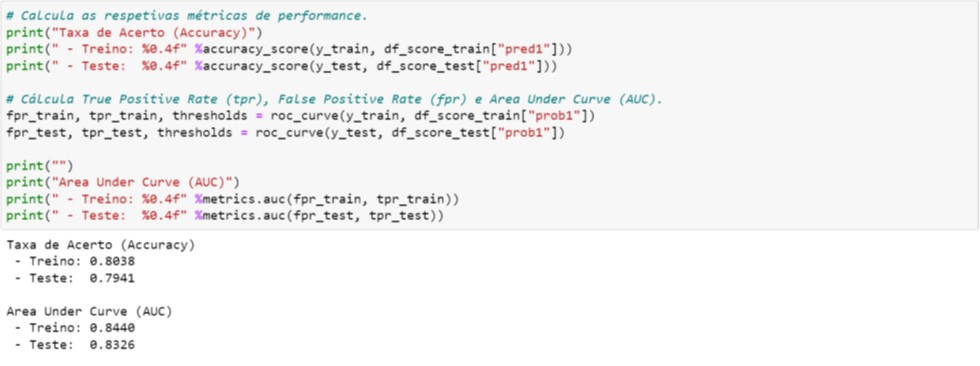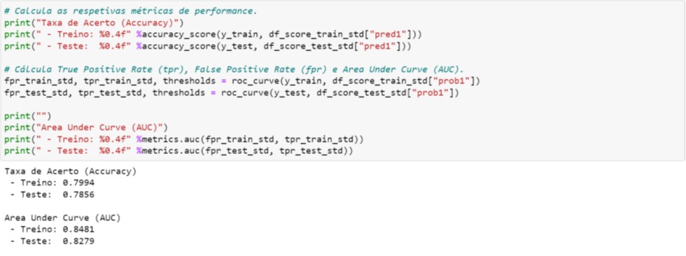 Na Figura 4.5 imprimimos duas métricas de performance: taxa de acerto (accuracy) e AUC (Area Under Curve). Para avaliação dos modelos, na Orbis Analytics analisamos sempre a AUC para avaliar e comparar a performance com outros modelos (outra métrica que utilizamos é o KS, que é o acrônimo de Komogorov-Smirnoff). Somente em situações específicas utilizamos as métricas provenientes da Matriz de Confusão, tais como, accuracy, precision, recall ou F1 Score (em breve, publicaremos um material que explorar as nuances das métricas de performance).
