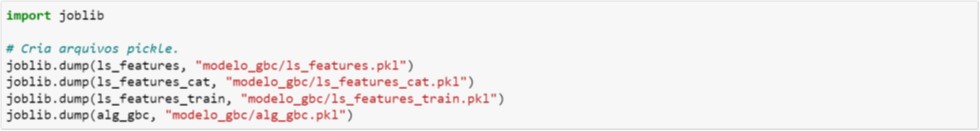 Para finalizar esta Seção, vamos gravar em arquivos todas as informações produzidas durante o treinamento do modelo e que serão necessários durante o processo de deployment (Seção 7). Estes arquivos serão gravados na extensão .pkl (pickle) conforme a Figura 4.9 abaixo: