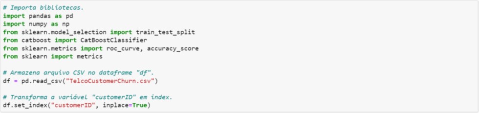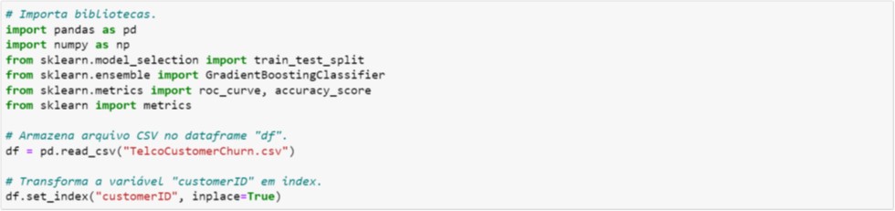 Nesta seção, vamos aplicar o algoritmo Gradient Boosting do pacote Scikit-Learn na base modificada vista na Seção 2. A Figura 4.1 ilustra a importação dos pacotes e em seguida a importação dos dados. Além disso, a variável customerID é transformada em índice.