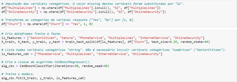 - Adicionalmente, CatBoost lida com variáveis categóricas não numéricas sem a necessidade de dicotomização via get_dummies() ou OneHotEncoder();