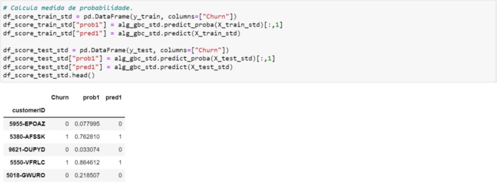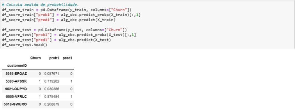 Note que a probabilidade de Churn (prob1 da Figura 4.7) e as métricas de performance (Figura 4.8) são iguais àqueles obtidos utilizando as variáveis originais (vide Figura 4.4 e Figura 4.5, respectivamente).