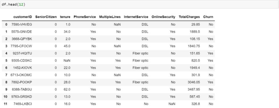 Uma das vantagens destes algoritmos é com relação a valor missing. Por isso, na base modificada inserimos propositadamente valor missing nas variáveis tenure, MultipleLines e OnlineSecurity, o que nos possibilitará a ilustração de procedimentos para lidar com registros nesta situação. A Figura 2.2 mostra como ficou a base modificada.
