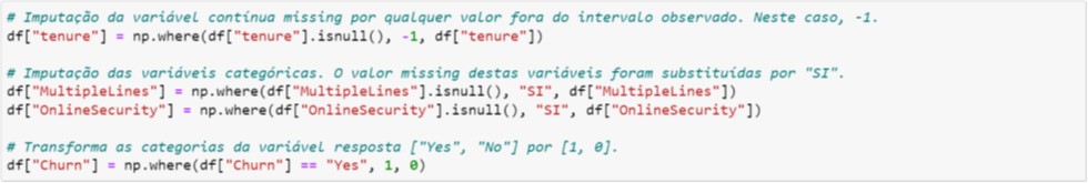 - Para variáveis categóricas não numérica, geralmente tratamos valor missing como sendo uma categoria (substituindo-o adequadamente por um código ou descrição), da mesma forma como fizemos com as variáveis MultipleLines e OnlineSecurity ao atribuí-lo como “SI” (Sem Informação). Em algumas situações raras, quando a frequência do valor missing é muito baixa, agrupamos em uma categoria já existente. Este procedimento dependerá de caso a caso.