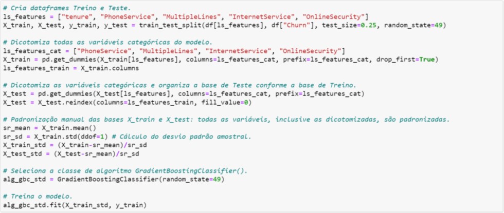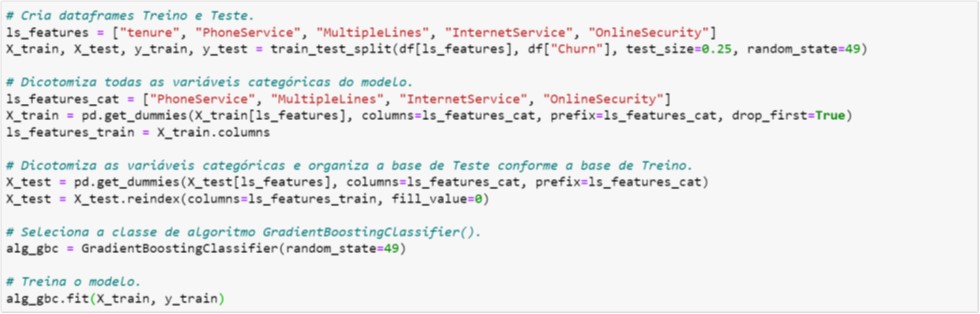 Na parte final da Figura 4.3, o modelo é treinado utilizando algoritmo Gradient Boosting. O hiperparâmetro random_state=49 é para que o leitor possa reproduzir exatamente os resultados contidos neste material.