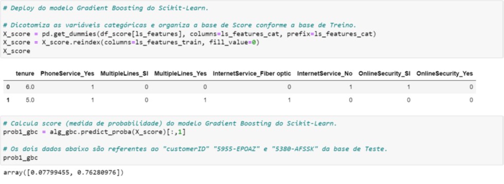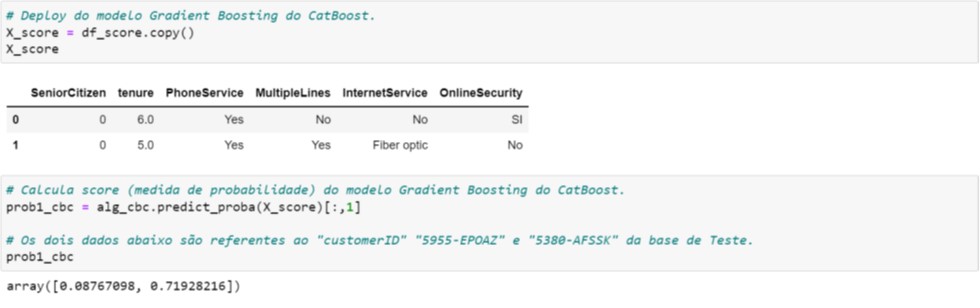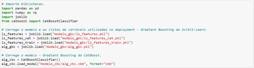 Na prática, trabalhamos com apenas um modelo e em geral aquele com a melhor métrica de performance. Portanto, se a escolha for pelo modelo de Gradient Boosting não é necessário carregar o modelo CatBoost, e vice-versa. Na ilustração acima carregamos ambos os modelos apenas com intuito de explorar as diferenças no processo de scoring.