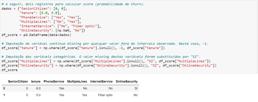Começaremos pelo Scikit-Learn (Figura 7.3). Note que durante o processo de dicotomização, utilizamos as listas de variáveis carregadas no início do script (vide Figura 7.1). Isto garantirá que a estrutura da base (X_score) seja a mesma da base utilizada no treinamento (X_train; vide Figura 4.3).