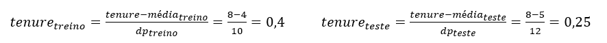 Um ponto de atenção na padronização da base de Teste: primeiramente as médias e desvios-padrão da base de Treino são calculados e em seguida aplicados na base de Teste! Isto garantirá que o valor de uma variável original nas bases de Treino e de Teste tenham o mesmo valor padronizado nas bases padronizadas de Treino e de Teste! Vejamos o seguinte exemplo: