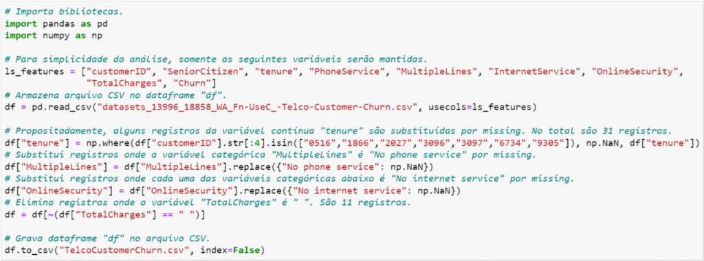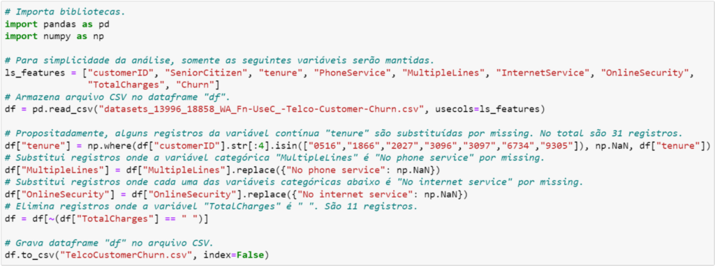 Para explorarmos as principais características e vantagens destes algoritmos, vamos fazer pequenas modificações na base original disponível no Kaggle (vide o link https://www.kaggle.com/datasets/blastchar/telco-customer-churn). As modificações são as seguintes (todas estas modificações podem ser consultadas na Figura 2.1):
