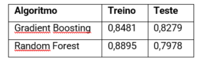 No caso do Random Forest, destacamos um ponto importante: a diferença entre AUC da base de Treino (0,8895) e da base de Teste (0,7978). Na Seção 4 comentamos que pode indicar overfitting do modelo quando a métrica da base de Treino for maior que a da base de Teste. Para Random Forest utilizamos os hiperparâmetros default, assim, deveremos ajustá-los adequadamente a fim de obtermos métricas equilibradas entre ambas as bases. Note que no Gradient Boosting (Figura 4.5) as métricas estão muito próximas! O quadro a seguir ilustra esta comparação: